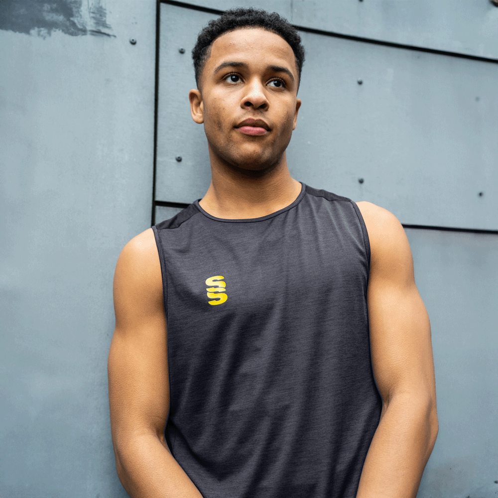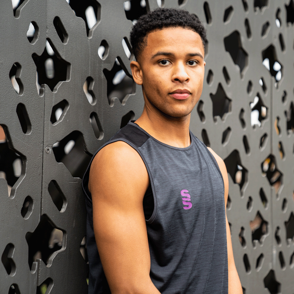 Melange polyester super stretchy material. Perfect for the gym - Great fit.