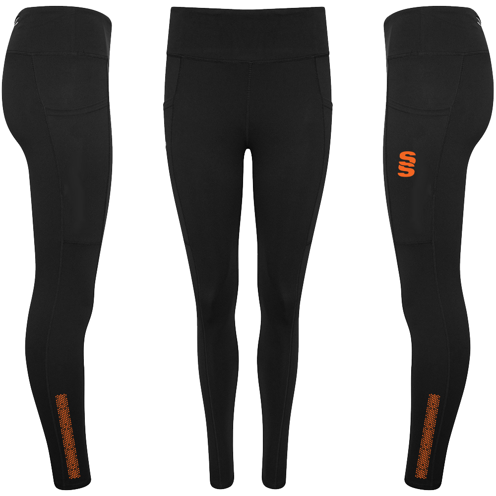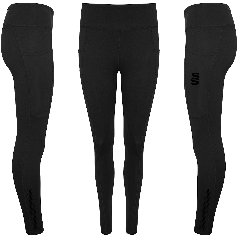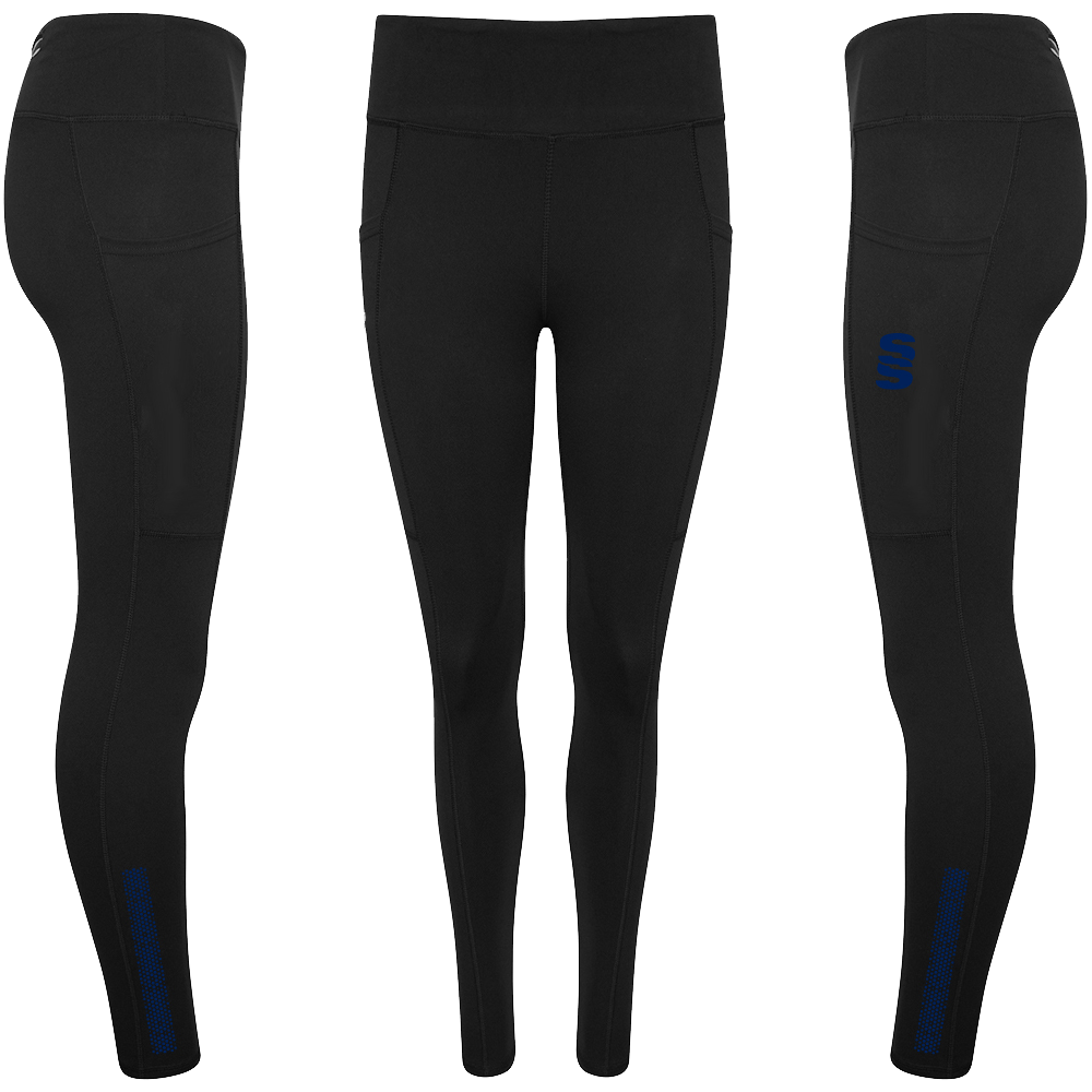 The Performance Full Length Leggings are made of fantastic, comfortable quality  85% Polyester and 15% Elastane. There no grinding on the material when stretched. They feature two side pockets for mobile phones and two smaller pockets (one with zip) for personal belongings, with an inner pocket for a key. To finish, a printed Surridge SS logo is situated on the left thigh.